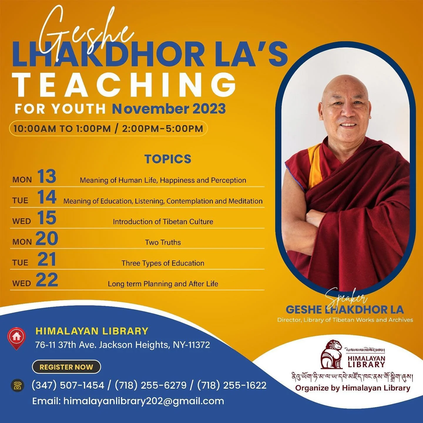 Geshe Lhakdor's Talks & Teachings Monday, November 13, 2023 10:00 AM Sunday, November 26, 2023 5:00 PM Various Location (map) Google Calendar ICS