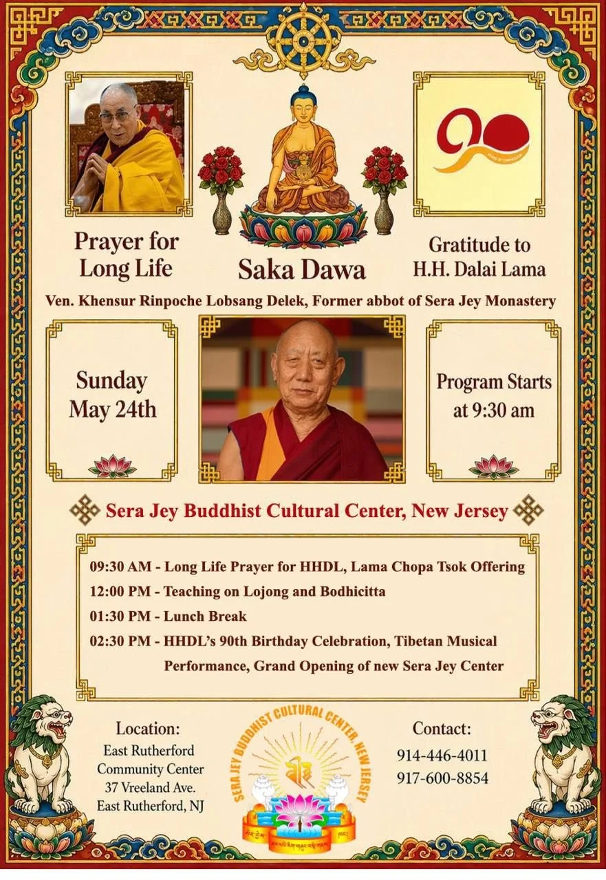 Back to All Events Saka Dawa Prayer and Celebration | Sera Jey Buddhist CulturalCenter Sunday, May 24, 2026 9:30 AM 10:00 PM East Rutherford Community Center 37 Vreeland Avenue East Rutherford, NJ, 07073 United States (map) Google Calendar ICS